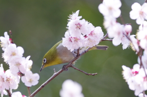 咲きそろった花ウメにメジロです。